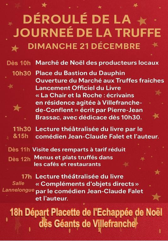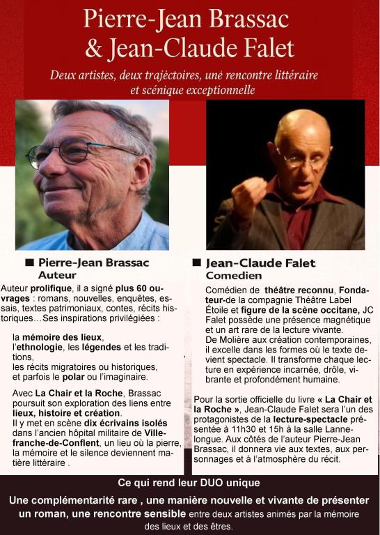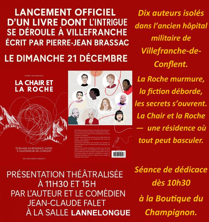 - 10h30 : Dédicace du livre de Pierre Jean Brassac "La chair et la roche" Des écrivains à Villefranche : Une résidence agitée